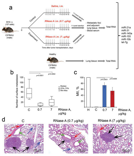 The ability of RNase A to affect metastasis was studied using a metastatic melanoma B16 model without a primary tumor node. The scheme of the experimental setup is depicted in Figure 5a. The B16 metastatic model was induced in mice by i.v. injection of B16 cells into the lateral tail vein of C57Bl mice (Figure 5a). Starting from day 4 after tumor implantation, the animals were assigned to three groups: 1 (C) —control injected i.m. with saline buffer; 2 and 3—injected i.m. with RNase A at the doses of 0.7 and 7 μg/kg, respectively, according to the scheme 5 + 2 for two weeks.