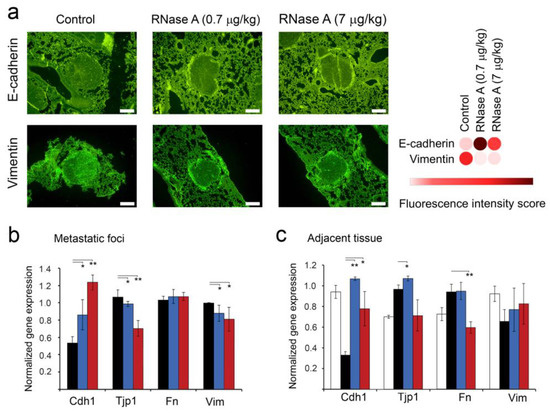 Epithelial–mesenchymal transition (EMT) involves modifications of gene expression, leading to the disruption of the epithelial phenotype and the building of the mesenchymal phenotype. EMT is an important event that regulates tumor invasion and metastasis [63,64]. Cadherin and vimentin are important genes of the EMT process. E-cadherin is highly expressed in epithelial cells and represents the extensive array of tight junctions closely holding the cancer cells to each other [65]. Reduced E-cadherin functionality through mutation, degradation, etc., is an essential contributor to metastasis progression in multiple different epithelial-based malignancies [66]. Vimentin, a major intermediate silk filament protein present in stromal cells, participates in cancer cells’ adhesion, invasion, migration and signaling by regulating the interaction between cytoskeletal proteins and cell adhesion molecules [67]. In this study, it was shown that RNase A administration led to an increase in the level of Cdh1 and decreases in the levels of Tjp1 and Vim in metastatic foci, which indicates a decrease in the invasive potential of metastatic cells. A similar pattern was observed for these markers in the lung tissue adjacent to metastatic foci, and the decrease in Fn expression was also observed. As a result, the adjacent tissue according to the profile of expression of EMT markers acquires a phenotype similar to that of healthy tissue, which indicates that RNase A disrupted the formation of a favorable tumor microenvironment.