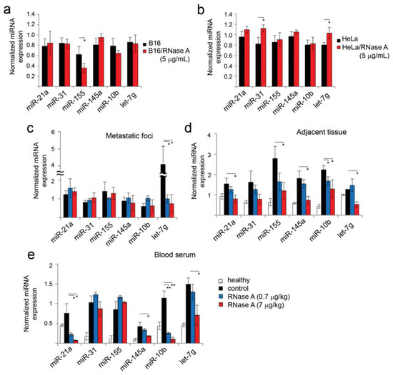 One of our main findings is that we were able to identify the differences in miRNA expression profiles between metastatic foci and adjacent tissues as well as between adjacent conditionally normal tissue and lung tissues collected from healthy animals. Interestingly, in adjacent conditionally normal tissues, we observed much higher levels of miRNAs in comparison with the healthy group and decreases in these miRNA levels after RNase A administration in a dose-dependent manner. It should be noted that in metastatic foci of the control group, miRNA levels were 2–3-fold lower in comparison with adjacent tissue. In metastatic foci, RNase A had no effect on the expression of analyzed miRNAs; their expression remained approximately at the same level. The exception was let-7g, whose level significantly decreased after the treatment with RNase A.