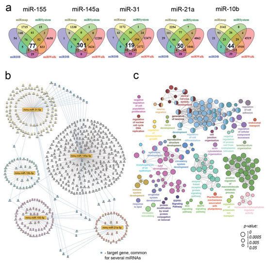 The target genes of RNase-A-susceptible miRNAs were predicted using four independent miRNA databases, namely miRmap (https://mirmap.ezlab.org/app/, accessed on 26 October 2021), miRSystem (http://mirsystem.cgm.ntu.edu.tw/, accessed on 26 October 2021), miRDB (http://mirdb.org/, accessed on 26 October 2021) and miRWalk (http://mirwalk.umm.uni-heidelberg.de/, accessed on 26 October 2021), followed by their Venn diagram analysis using the Venny 2.1 tool (http://bioinfogp.cnb.csic.es/tools/venny/index.html, accessed on 26 October 2021). The regulome of RNase-A-susceptible miRNAs and their target genes common for all used miRNA databases were reconstructed and visualized by Cytoscape 3.9.0. Functional annotation of revealed miRNA target genes was carried out by ClueGO plugin [42] using Gene Ontology (biological processes), Kyoto Encyclopedia of Genes and Genomes (KEGG), REACTOME and Wikipathways databases. Term enrichment was tested with a two-sided hypergeometric test that was corrected by the Bonferroni method. Only terms with p ≤ 0.05 were included in the analysis. Functional grouping and linking of the enriched terms were performed with kappa statistics (kappa score = 0.4). The regulatory network containing genes associated with biological processes related to cell adhesion was reconstructed and visualized by STRING database and Cytoscape 3.9.0, respectively.