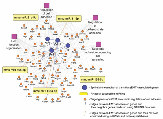 Our results demonstrate that the antitumor potential of RNase A is tightly associated with the suppression of EMT-related processes. RNase A was found to effectively inhibit motility (Figure 4) and enhance the adhesiveness (Figure S2) of tumor cells as well as block their metastasis (Figure 5); moreover, RNase A significantly affects the expression of key EMT markers not only in B16 melanoma metastatic foci but also in the tissue surrounding them (Figure 6). Considering the high enrichment of a range of EMT-related terms in the pathway network of RNase-A-susceptible miRNA target genes (Figure 8c), we next questioned whether these miRNAs could be involved in the regulation of anti-EMT activity of RNase A. To understand this, a regulatory network consisting of (i) RNase-A-sensitive miRNAs (Figure 7), (ii) their target genes included in EMT-related functional terms (Figure 8c) and (iii) RNase-A-susceptible EMT-associated markers (Cdh1, Fn1, Tjp1, Vim) was reconstructed (Figure 9). The obtained data indeed demonstrate that the inhibitory effect of RNase A on a panel of miRNAs in metastatic foci and adjacent tissue can underlie observed changes in the expression of EMT-related key genes in these compartments: the level of analyzed EMT markers can be regulated directly by RNase-A-susceptible miRNAs (miR-10b, miR-31, miR-145a) or indirectly by a range of miRNA-targeted genes predicted by our in silico approach (Arf6, Ctnnd1, Fzd7, Gdnf, Smad3, Pxn, Ret) (Figure 9). Since these findings were based on computational analysis, their further experimental verification is required.