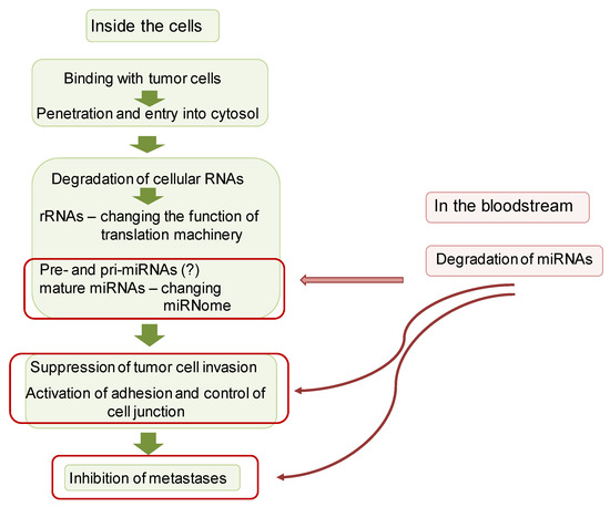 Based on the obtained data, we hypothesized a potential mechanism of antitumor activity of RNase A (Figure 10). Obviously, this scheme presents a simplified view of the anticancer action of RNase A, consisting of binding to a tumor cell, entering the cytosol, degrading intracellular RNAs, including rRNAs and miRNAs, followed by the suppression of migration and invasion of tumor cells, activation of adhesion and control cell junction and inhibition of metastases. Taking into account that RNase A caused the degradation of miRNAs in the bloodstream, we cannot exclude the effect on these events of the changed miRNA profile in the bloodstream. The downstream mechanisms of RNase A antitumor activity may include the alteration of miRNA expression, downregulation of tumor suppressors and oncomirs, upregulation of adhesion genes, control and organization of the cell junction and finally the attenuation of tumor malignancy and metastasis.