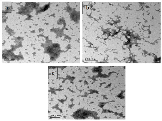 Probiotic bacteria including Lactobacillus acidophilus, Bacillus amyloliquefaciens and Bifidobacterium bifidum with chitosan aqueous solution (chitosan dissolved in 100 mL of distilled water and acidified with glacial acetic acid to attain 0.4% concentration (w/v); Sigma-Aldrich Saint Louis, MO, USA) were incorporated into 10 mL of 20 g/L sodium alginate (Sigma-Aldrich Saint Louis, MO, USA). After that, the prepared solution was filtered for eliminating insoluble material. The solution of sodium alginate was then added into the prepared chitosan solution and stirred to form beads. In the next step, these beads were strained from the chitosan solution and then rinsed with sterilized distilled water. Samples were dried under vacuum, with a freeze-drier (Freezedryer Lyobeta25). Dried cells were deposited in a dark place at 4 °C. The characterization of multi-strain-probiotic-loaded nanoparticles (MSP-NPs) was evaluated by transmission electron microscopy (TEM; Figure 1).