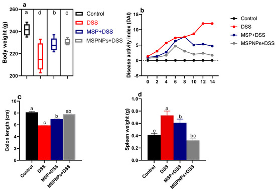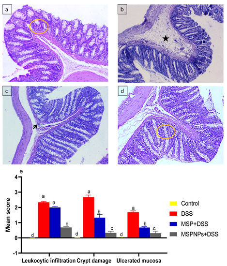 The effects of MSPNPs on ameliorating the severity of the clinical signs after the induction of colitis in rats are described in Figure 2. Notably, rats from DSS groups exhibited remarkable weight loss (up to 12%) compared with the 2.7% weight loss of the free-MSP-treated group (Figure 2a). Higher DAI scores were detected in the DSS-induced group due to an increased incidence of weight loss, diarrhea and rectal bleeding, while treatment with MSPNPs reversed the elevated DAI scores after the induction of colitis. Rats in the MSPNP-treated group showed the most significant (p < 0.05) colon length (8.1 ± 0.18 vs. DSS group of 5.88 ± 0.27 cm) (Figure 2b,c). Notable spleen enlargement was found in DSS colitic rats, while this enlargement was greatly reduced in the group treated with MSPNPs, unlike the non-colitic group (Figure 2d). All rats in the DSS group treated with MSPNPs were alive throughout the experimental period.