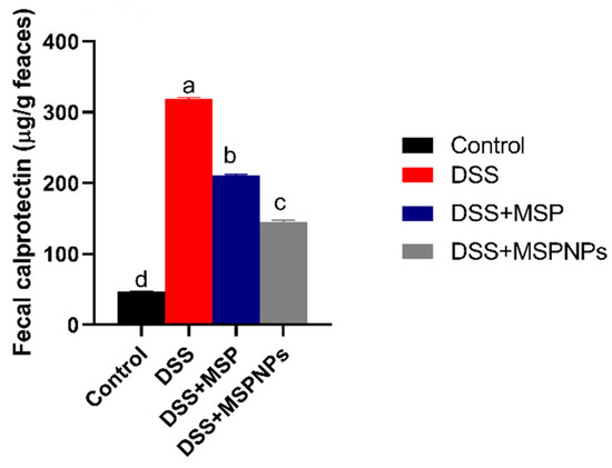 The levels of calprotectin in fecal samples after the induction of colitis are described in Figure 3. The fecal calprotectin levels in the colitic group were significantly (p < 0.05) elevated, while in the group treated with free MSPs, their levels were reduced. The prominent decline in fecal calprotectin levels was remarkably observed to be more pronounced in the MSPNP-treated group than in the free-MSP-treated group (p < 0.05) when compared with the colitic group.
