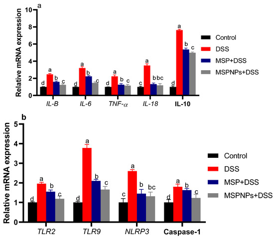 Moreover, a significant upregulation of TLR2 and TLR9 was observed in the group with active colitis. Of note, their excessive expression levels were significantly reduced in the group treated with MSPNPs more than in the group treated with free MSPs after colitis induction.