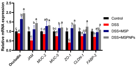 As shown in Figure 5, following DSS exposure, the expressions of tight-junction-related genes were markedly reduced in the DSS-induced group when compared with the control non-colitic group. Meanwhile, the expressions of occludin, JAM, ZO-1 and CLDN-1 reached their peak in the colitic group that received MSPNPs (increased 1.96-, 1.44-, 1.37- and 1.25-fold vs. control non-colitic group). The high expressions of MUC-2 and MUC-5 were more prominent in the group that received MSPNPs followed by the group that received free MSPs when compared with the control non-colitic group (increased 1.32-, 1.37-, 1.28- and 1.17-fold, respectively). On the other hand, the expression of FABP-2 in groups treated with either free MSPs or MSPNPs exhibited no statistical differences when compared with the control non-colitic group.
