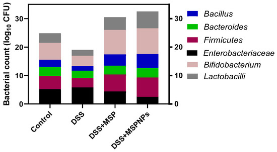 The efficacy of orally administered MSPs or MSPNPs on the counts of bacterial populations in the colon are displayed in Figure 6. Notably, the colitic groups that received MSPs or MSPNPs showed unique alterations in the microbial population when compared with other groups (control or DSS groups). The abundance of beneficial bacterial populations was considerably increased; on the contrary, the abundance counts of the pathogenic ones were significantly reduced. Remarkably, compared with the DSS group, the colitic group that received MSPNPs showed the highest Firmicutes abundance. Furthermore, the counts of beneficial bacterial populations (Bacillus, Lactobacillus and Bifidobacterium) were assessed in the colitic groups that received MSPNPs (4.96, 5.97 and 8.97 CFU/g) and free MSPs (3.97, 4.48 and 8.60 CFU/g) and compared with the DSS-induced group (2.59, 3.37 and 3.67, respectively). Moreover, the population of Enterobacteriaceae was more prominently reduced in the colitic group that received MSPNPs.