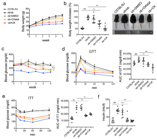 3.1. CK Reduces Body Weight and Blood Glucose in Obese Mice