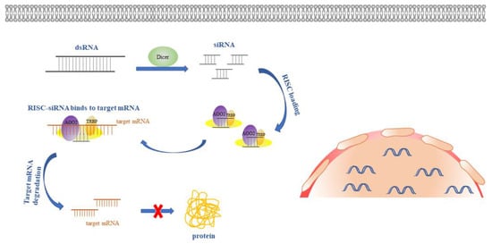 The concept of RNAi (RNA interference) has emerged with the revelation that double-stranded ribonucleic acid (dsRNA) can induce mRNA degradation. As a natural mechanism, RNAi mediators can regulate target gene silencing in the majority of eukaryotic cells [1]. Small interfering RNA (siRNA), which is a short stretch of dsRNA consisting of 20–25 nucleotides, is the most noticeable candidate among the several varieties of nucleic acids involved in RNAi. Typically, long dsRNA is cleaved into siRNA in the cytoplasm by Dicer. siRNA is then loaded onto the RNA-induced silencing complex (RISC) with associated proteins. The antisense strand (AS) in siRNA binds to the target mRNA via complementary pairing, and then the target gene is cleaved by the AGO2 protein, resulting in gene silencing [2,3] (Figure 1).