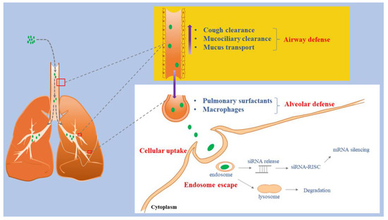 Once they enter the blood circulation system, siRNA delivered systemically are likely to be degraded by the abundant endonucleases in the serum. Because siRNAs are negatively charged and have large molecular weights and poor stability, the half-life of siRNA is short. In theory, siRNA pulmonary inhalation has significant clinical therapeutic advantages compared to systemic administration [51]; however, in practice, there are significant challenges (Figure 2).