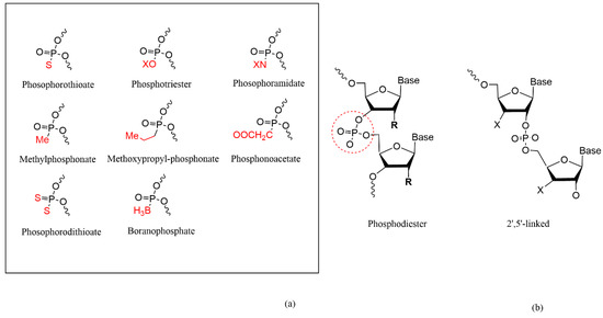 Chemical modification types of siRNA phosphate linkage. (a) The modifications of phosphodiester bond; (b) The modification of 2′,5′-phosphodiester linkage.