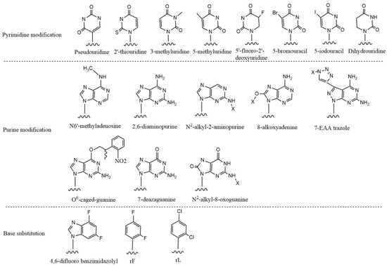 N6′-methyladenosine (m6A) is a naturally modified nucleoside that contains a methyl group at the adenosine N6 position. Replacing all adenosine with m6A can diminish the immunological response generated by siRNA, whether on AS or SS [97]. The addition of 5-bromouracil, 5-iodouracil, and 2,6-diaminopurine increases the stability of A-base pairing and the affinity of siRNA for the target mRNA, but inhibits siRNA double-strand unwinding and thus inhibits RNAi efficacy [98]. The Tm value of siRNA decreases when 2,4-difluorobenzene (rF) and 2,4-difluorochlorine (rL) are substituted for U, but modified siRNA still maintains substantial gene repression activity, owing to the structural similarity of rF and rL to U [99].