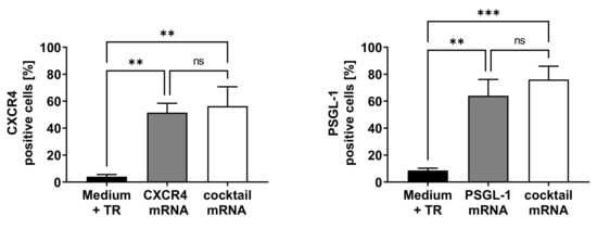 Analysis of CXCR4 and PSGL-1 expressions on the surfaces of EPCs after transfection with CXCR4 and PSGL-1 mRNA. A total of 1 × 105 EPCs were seeded and transfected after 24 h with either 1 µg CXCR4, 1 µg PSGL-1 mRNA, or both mRNAs (mRNA cocktail). The CXCR4 and PSGL-1 expressions on the cell surfaces were analyzed 24 h post-transfection using flow cytometry. Cells treated only with medium and transfection reagent (TR) were used as negative control. Results are shown as mean + SD (n = 3). Statistical differences were determined using one-way ANOVA multiple comparisons, followed by Bonferroni’s multiple comparisons test (** p < 0.01 and *** p < 0.001; ns: nonsignificant).