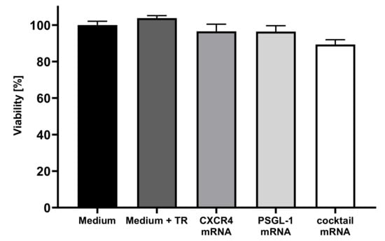 Analysis of cell viability of EPCs after transfection with CXCR4 and PSGL-1 mRNA. A total of 1 × 105 cells were seeded and transfected after 24 h with 1 µg of CXCR4, PSGL-1 mRNA, or both mRNAs (mRNA cocktail). The viability was analyzed 24 h post-transfection using a PrestoBlue™ cell viability assay. The viability of cells incubated only with the medium was set to 100%. Results are shown as mean + SEM (n = 3).