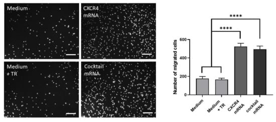 An important chemoattractant for the homing of EPCs to a site of injury is SDF-1α, which directs EPC migration by binding to CXCR4. Therefore, the chemotactic migration potential of mRNA-modified EPCs was determined using a transwell migration assay. After transfection with 1 µg CXCR4 mRNA or the mRNA cocktail (1 µg CXCR4 and 1 µg PSGL-1 mRNA) and further overnight incubation, 5 × 104 cells were seeded into transwell inserts and analyzed after 6 h of incubation. The migrated cells were stained with 1 µg/mL DAPI and automatically counted using Image J software (Figure 3).