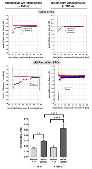 Analysis of the adhesion strength of EPCs to activated endothelium using single-cell atomic force microscopy (AFM). Representative histograms of the adhesion signature of CXCR4 and PSGL-1 mRNA (mRNA cocktail) modified and native EPCs to TNF-α-activated and nonactivated endothelium and the quantification of adhesion forces are shown. Bonds formed between the cell surface ligands (PSGL-1) and molecules on HUVECs (E-selectin) broke slightly with increasing force until the cell completely detached from the HUVEC. The maximum downward force of the cantilever’s tip is referred to as detachment force (Fdetach). (n = 4). Statistical analysis was performed using two-way ANOVA, followed by Bonferroni´s multiple comparisons test (** p < 0.01 and **** p < 0.0001).