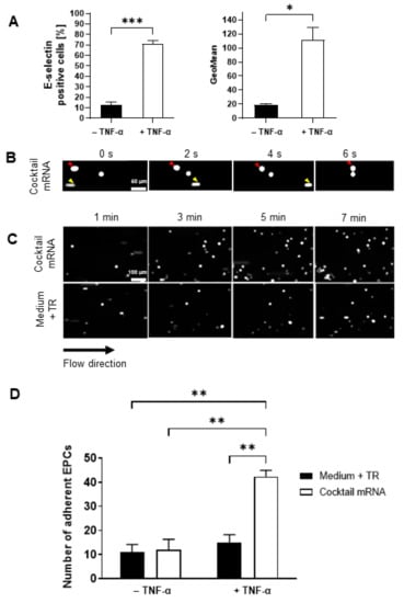 The homing of mRNA-modified EPCs on inflamed endothelium was analyzed in a dynamic flow model. To stimulate inflamed conditions in vitro, the HUVECs were treated with 10 ng/mL TNF-α, which is a strong activator of the endothelium. As shown in Figure 5A, the treatment of HUVECs with TNF-α resulted in a significant upregulation of E-selectin expression compared with untreated cells, demonstrating the inflammatory response of the endothelial cells to TNF-α.