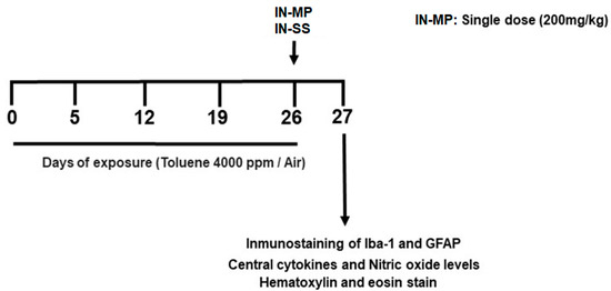 Experimental design. At the beginning animals were exposed to toluene 4000 ppm or air for four weeks. Two hours after the last exposure the animals received a single dose of intranasal MP (IN-MP) or intranasal SS (IN-SS). One day later, the expressions of Iba-1 and GFAP were assayed by immunofluorescence and central cytokines and nitric oxide levels were evaluated by enzyme-linked immunosorbent assay (ELISA) and Griess reaction, respectively. Histological analysis was performed with hematoxylin and eosin staining 24 h after the treatment.