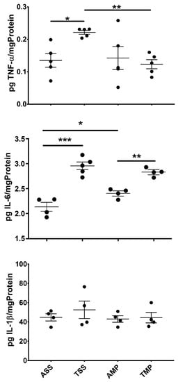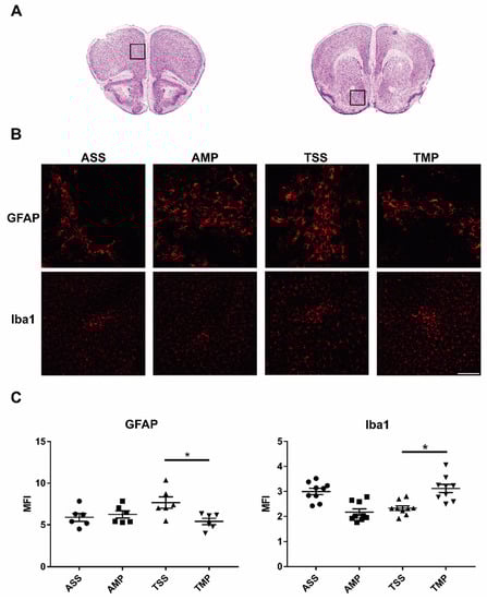 Toluene treatment does not significantly modify the expression of Iba-1 (p > 0.05) in both areas, in comparison to AMP or ASS groups. In contrast, in the TMP group, the expression of Iba1 was significantly increased compared to the TSS group (p < 0.001), probably due to the establishment of a M2 polarized microgliosis (Figure 4C).