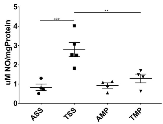 Central nitric oxide levels (µM/mg protein) in soluble extract from brain of mice repeatedly exposed to toluene and measured by Griess reaction. All results are shown as the mean ± standard error of groups values. ** p < 0.01, *** p < 0.001. ANOVA followed by Tukey’s test were performed. Air + saline solution (ASS); toluene + saline solution (TSS); air + methylprednisolone (AMP); toluene + methylprednisolone (TMP).