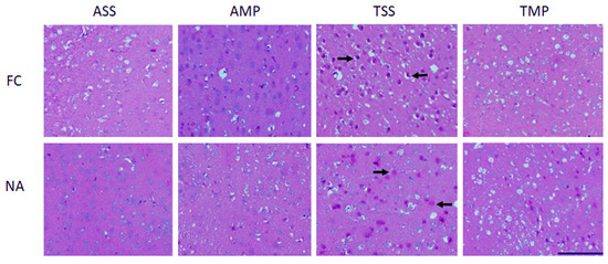 Histological examination of brains of mice repeatedly exposed to toluene and those with a previous exposure toluene and then treated with methylprednisolone. Hematoxylin-eosin stains of brain sections at frontal cortex (FC) and nucleus accumbens (NA). Scale bar represents 100 µm. Air + saline solution (ASS); air + methylprednisolone (AMP); toluene + saline solution (TSS); toluene + methylprednisolone (TMP). Arrows show nuclear damage in TSS group in both FC and NA regions. Treatment with IN-MP reduced nuclear damage (TMP).