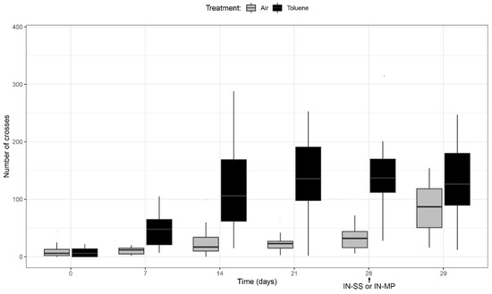 Mean ± SD of the number of crosses performed by 68 mice, half treated with air and the other half with toluene for 28 days. A group of 30 mice were then treated with one dose of IN-MP (200 mg/kg) and the locomotor activity was registered 24 h later. Values were compared by a T-student test.