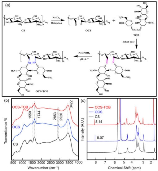 The synthesis mechanism of OCS-TOB is shown in Figure 1a. First of all, CS is oxidized by NaIO4, resulting in the cleavage of C2-C3 bonds and the formation of aldehyde groups. Secondly, TOB is grafted onto the OCS by the Schiff base reaction. Finally, the -C=N- bond between TOB and OCS is replaced by -C-NH-, and TOB was grafted onto the backbone of OCS after the reductive amination by NaCNBH3.