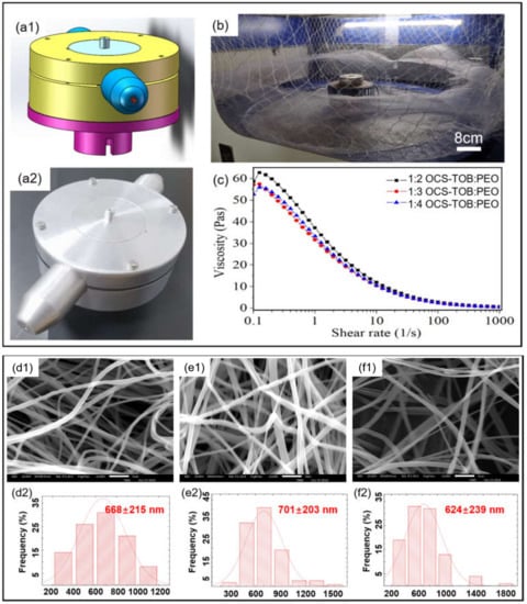 Virtual model and the corresponding optical photo of self-designed centrifugal spinning equipment (a1,a2,b); the viscosities of three different ratios of OCS-TOB/PEO solutions change with shear rate (c); SEM images of OCS-TOB/PEO sub micro-fibers with different ratios of solutions with corresponding fiber diameter distribution, 1:2 OCS-TOB/PEO (d1,d2), 1:3 OCS-TOB/PEO (e1,e2) and 1:4 OCS-TOB/PEO (f1,f2), the scale bar is 5 μm.