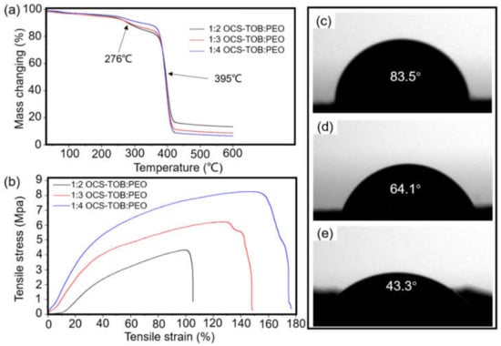 The TGA results of different ratios of OCS-TOB/PEO composite sub micro-fibers (a); mechanical test of the produced OCS-TOB/PEO sub micro-fiber yarn (b); the contact angle test of different ratios of OCS-TOB/PEO sub micro-fiber mats: 1:2 OCS-TOB/PEO (c), 1:3 OCS-TOB/PEO (d) and 1:4 OCS-TOB/PEO (e).