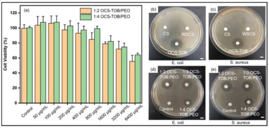Cell viability of 1:2 OCS-TOB/PEO and 1:4 OCS-TOB/PEO in 24 h (a); inhibition effect of CS, WSCS and OCS-TOB against E. coli (b) and S. aureus (c); and inhibition effect of different ratios of OCS-TOB/PEO sub micro-fibers against E. coli (d) and S. aureus (e). Scale bar is 5 mm.