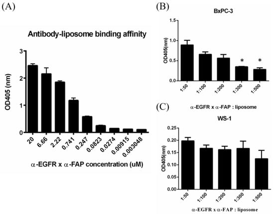 Assessment of binding affinity of BS−LipoIRI. (A) Different concentrations of anti-EGFR/anti-FAP antibody for LipoIRI. (B) BxPC3/EGFR cellular binding affinity and (C) WS1/FAP cellular binding affinity. (Data are presented as mean ± SD, *: p < 0.01.)