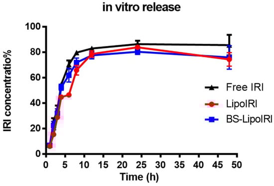The drug release profile of BS−LipoIRI and LipoIRI was evaluated at pH 7.4 PBS. As depicted in Figure 3, the cumulative release of irinotecan reached a plateau after 24 h. Within 24 h, the release rate of the BS−LipoIRI was similar to that of LipoIRI, which indicated that modification of the anti-EGFR/anti-FAP antibody did not affect the drug release. The results showed that there was no significance between Free IRI, LipoIRI, or BS−LipoIRI.