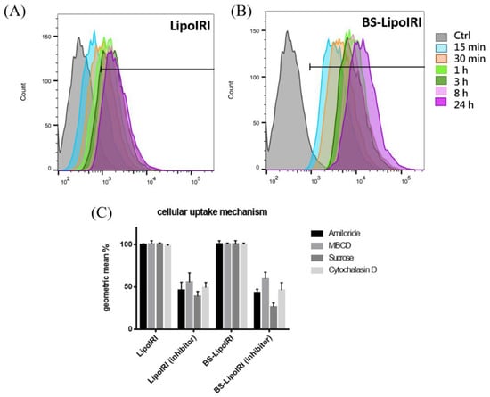 Cellular uptake of the (A) DiI-labeled LipoIRI or (B) DiI-labeled BS−LipoIRI was examined after incubation of cells at 15 min, 30 min, 1 h, 3 h, 8 h, and 24 h. (C) BxPC3 cells were treated with DiI-labeled LipoIRI or BS−LipoIRI for 2 h in the presence of various inhibitors or without inhibitors.