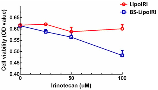 Liposomes are thought to be a great drug carrier for cancer therapy, and there are many clinical products, such as Doxil®, Onivyde®, and Mepact® [,,]. The mechanism of liposomal drug delivery was indicated by previous studies, which revealed that the hydrophilic drugs are encapsulated into the central aqueous core of the liposome and are shielded from the body’s aqueous environment by the lipid bilayer [,]. After a while, the bilayer deteriorates, and the liposomes release their inner drug contents. Liposomal irinotecan has been developed for overcoming the pharmacological and clinical limitations of free irinotecan drugs [,]. It has a high-drug loading capacity and high stability in vivo, and was thought to enhance the drug permeability of the tumor site. However, the property of lacking active targeting ability causes most of the irinotecan drugs to accumulate in the body’s vital organs []. Although they have proven their benefit for clinical therapy, non-target particles still have side effects on the body or unstable therapeutic effects [,]. It is urgently needed to develop a tumor-specific targeting drug carrier. We first constructed a stable antitumor/anti-cancer-associated fibroblast dual-targeting BS−LipoIRI. Our results showed that BS−LipoIRI had a mean particle size of approximately 120 nm, drug encapsulation rate >75%, and drug loading approximately >7%, indicating its suitability for drug delivery to the tumor site in vivo by the EPR effect []. Moreover, the dual-targeting ability of BS−LipoIRI was revealed in the BxPC-3 (human pancreatic cancer cells) and WS-1 (human fibroblast cells) binding affinity experiments. In vivo biodistribution assay indicated that treatment with BS−LipoIRI would increase the drug level at the tumor site, and decrease the drug level in the spleen, which shows its specific targeting in the body [].