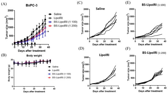 (A) The BxPC3 tumor growth curve after intravenous administration at a dosing regimen of 20 mg/kg IRI. (B) Body weight changes in tumor-bearing mice. Tumor size of individual mouse in the (C) Saline, (D) LipoIRI, (E) BS−LipoIRI (1:100), and (F) BS−LipoIRI (1:200) group. * p < 0.01, a statistically significant difference compared with the saline group.