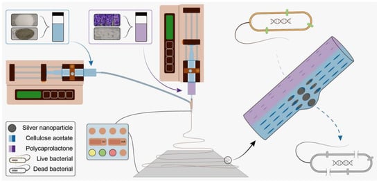 Dressings play an important role in the treatment of wounds, acting both to prevent infection and accelerate healing. In recent decades, a range of novel wound dressings has been developed based on technologies such as sponges [1,2], hydrogels [3,4], fibers [5,6,7,8], and particles [9,10], among others. Unlike traditional wound dressings, various functions have been added to these new formulations, such as anti-inflammatory, anti-bacterial, and/or anti-adhesion properties, the ability to absorb tissue exudate, and the inclusion of active ingredients for the promotion of wound healing [11,12]. Among these properties, antibacterial performance is important for wound dressing. As bacteria can lead to a series of symptoms in the wound and prolong the healing period, it should be eliminated first and kept away from the wound. Thus, various small-molecule substances, which have antibacterial performance, including organic and inorganic, are applied in wound dressings for that purpose. Drug-loaded fibers have been applied as dressings in a number of studies [13,14,15]. Such fibers can offer controlled drug release and have huge potential as wound dressing [16,17,18]. Of all of the various fiber preparation methods, the “one-step” electrospinning technology has been frequently favored by researchers [19,20].