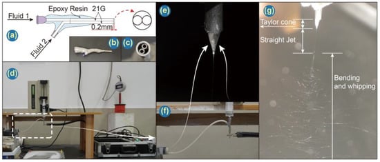 (a) Schematic and (b,c) photographs of the Janus; (d) image of the complete electrospinning apparatus; (e) Photograph of the Taylor cone obtained with two working fluids; (f) photograph of the working fluids; (g) digital image of the electrospinning process.