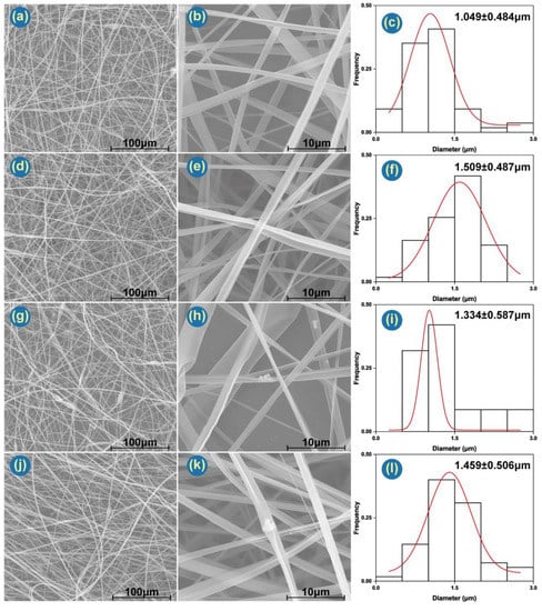 SEM images of the fibers: (a,b) F1; (d,e) F2; (g,h) F3; (j,k) F4. (c,f,i,l) are the distributions of fiber diameter determined from (b,e,h,k), respectively.