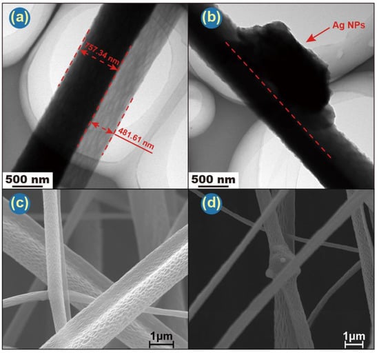 Combined with SEM and TEM images, Janus’s structure can be clearly observed. TEM images (Figure 4a,b) also depict representative Janus structures for both F1 and F4. F1 has a PCL side of ca. 757 nm and a CA side of 482 nm. Ag NPs in F4 are clearly visible in Figure 4b. Careful observation of the SEM (Figure 3b,e,h,k and Figure 4c,d) and TEM images (Figure 4a,b) reveals that there are many pores on the surface of both sides of the fibers. Figure 4c indicates the pore on the CA side are bigger and deeper than those on the PCL side. This may be governed by two parameters: solvent evaporation and polymer diffusion before fiber collection. According to Ref. [69], moderate and poor solvents for a given polymer cause nonuniformity in the polymer solution, hampering diffusion during the drawing process and resulting in a rough morphology.