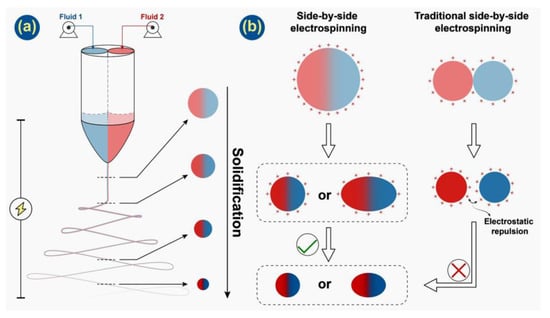 (a) Solidification process of working fluid along with side-by-side electrospinning; (b) charge distribution on the surface of this work compared with traditional side-by-side electrospinning.