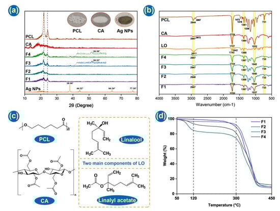The physical form of the raw materials and fiber mats was characterized by XRD. From Figure 6a, it can be seen that PCL possesses two strong Bragg reflections in the region of 20°~25°, consistent with its semicrystalline structure. The intensities of these were weakened in four nanofiber mats, which might be indicative of reduced crystallinity. This is logical since electrospinning can solidify a solution very rapidly, which means there is minimal time available for the organization of molecules to form a crystalline structure. CA demonstrates a broad halo in its XRD pattern, typical of an amorphous material. The Ag NPs indicate the expected Bragg reflections at 38.06° (111), 44.22° (200), 64.24° (220), and 77.30° (311). These are consistent with the literature structure PDF#04-0783. F3 and F4 indicate faint Ag NP reflections at 38.38° and 38.82°, confirming successful loading into the formulation.