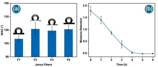 (a) Water contact angle tests of four kinds of Janus fiber; (b) moisture retention test for F1.
