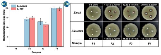 Antibacterial effects of the formulations. (a) Histogram and (b) photographs of the zones of inhibition.