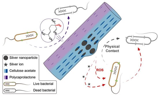 The Ag NPs are clearly distributed throughout the CA side of the fibers (Figure 4d). The antibacterial ability of Ag NPs comes both from the NPs themselves and also from silver ions leached from them [70]. Both can induce oxidative stress, which will produce reactive oxygen species (ROS) and free radicals [71]. The presence of Ag NPs, which are exposed to the same humid environment as bacteria, should result in both the Ag NPs and freed Ag+ ions being able to interact with target bacteria, thus resulting in a potent antibacterial performance.