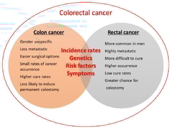 Colorectal carcinoma starts in the colon or the rectum. These cancers can also be called colon or rectal cancers, depending on where they start. Therefore, the two are combined in the term “colorectal cancer” (CRC) or are used interchangeably [40]. Indeed, colorectal cancer is the common name for colon and rectal cancers. They are often grouped because of the many common features, such as some clinical symptoms (bleeding, pain, and changes in stool), diagnosis, risk factors, and genetics. However, there are certain differences between colon and rectal cancers, and they include the place in the organisms where they start, disease recurrence, sex differences, invasion of nearby tissues, and treatment options (Figure 1) [41]. Both the colon and rectum are part of the large intestine (or large bowel), which is part of the digestive system, also called the gastrointestinal (GI) system. The colon is about 5 feet (150 cm) long and is divided into five major segments [42]. The rectum is the last segment. It is five to six inches long and connects the colon to the anus. The colon and rectum play important roles in digestion by aiding in the absorption of water, minerals, nutrients, and storage of wastes. The function of the colon is to absorb water and salt from the remaining food after it goes through the small intestine. The waste matter that is left after going through the colon goes into the rectum, and it is stored there until it passes through the anus [43,44].