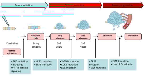 Genomic instability (chromosomal instability, microsatellite instability, and CpG island methylation phenotypes) plays a critical role in the early stages of CRC development [50,51,52,53]. In the late stages, when CRCs acquire a more aggressive phenotype and become more invasive and metastatic, a critical step is an epithelial-mesenchymal transition (EMT) (Figure 2) [50,51,54,55,56]. In EMT the cells lose their epithelial characteristics, including their polarity and specialized cellular contacts, and acquire a fibroblast-like morphology with a migratory behaviour, allowing them to move to the surrounding tissue. Cell adhesion molecules such as E-cadherin and zona occludens-1, are repressedby some mesenchymal markers, such as vimentin and N-cadherin. Some growth factors, such as the transforming growth factor-β (TGF-β), appeared to be responsible for the induction of EMT. It was also demonstrated that the wingless/int-1 (WNT)/β-catenin signalling pathway as well as the loss of E-cadherin were considered the major effectors of EMT [50,57,58,59,60,61,62] (Figure 2).