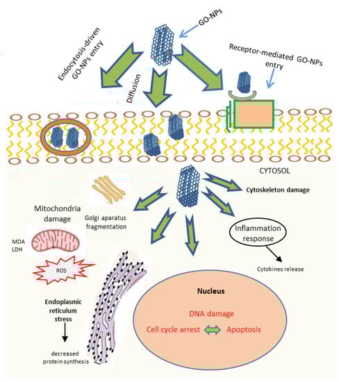 We provided a schematic illustration of some of the pathways for NP delivery to the cells and highlighted the implications on the cellular compartments and their fates in Figure 4. The well-studied mechanism of nanoparticle delivery to the cell involves the following steps: NPs get into cells in different ways, mainly through diffusion, endocytosis, and/or binding to receptors, and induce reactive oxygen species (ROS) generation, LDH and MDA increase, and cytokines release, which, in turn, can cause oxidative stress, loss in cell functionality, pro-inflammatory responses, and mitochondrial damage. The uptake of graphene into the nucleus may cause DNA-stranded breaks and the induction of gene expression via the activation of transcription factors, cell death, and genotoxicity.
