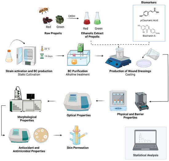 Overview of the production steps and characterization of wound dressing based on BC and the ethanolic extract of green and red propolis, p-coumaric acid, and biochanin A. Image created with Biorender.com (accessed on 30 March 2022).