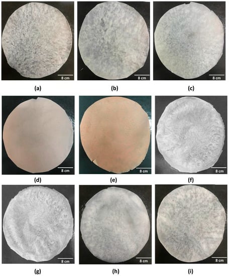 Visual appearance of the nine wound dressings based on pure BC or BC incorporated with active molecules: (a) F1; (b) F2; (c) F3; (d) F4; (e) F5; (f) F6; (g) F7; (h) F8; and (i) F9.